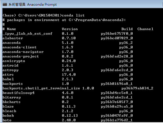 隨著套件越裝越多,可以透過 conda list指令了解 Anaconda內裝了哪些包,以及對應的版本