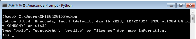 接下來我們試試看 Python能不能正常運作, 點選 Anaconda Prompt (相當於 Anaconda的 cmd),並輸入Python,如果如下圖出現 >>>符號就代表成功了,接下來輸入exit() 離開 Python