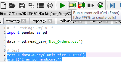 這兩個執行按鈕的差別在於一個是執行整份 py檔,另一個則可以反白選取想要執行的區塊,而沒有被反白的 code則不會被執行,以下圖為例,當我選取第7-8行並按下執行特定區塊鍵時,前面的1-6行就不會被執行到。這樣做的好處在於假如我對 pandas套件不熟,要嘗試很多錯誤後才知道正確寫法的情況下,就不用每次都要重讀資料或執行前面正確的程式碼,當資料龐大或是程式碼很長時,這樣的做法是可以節省很多時間的。